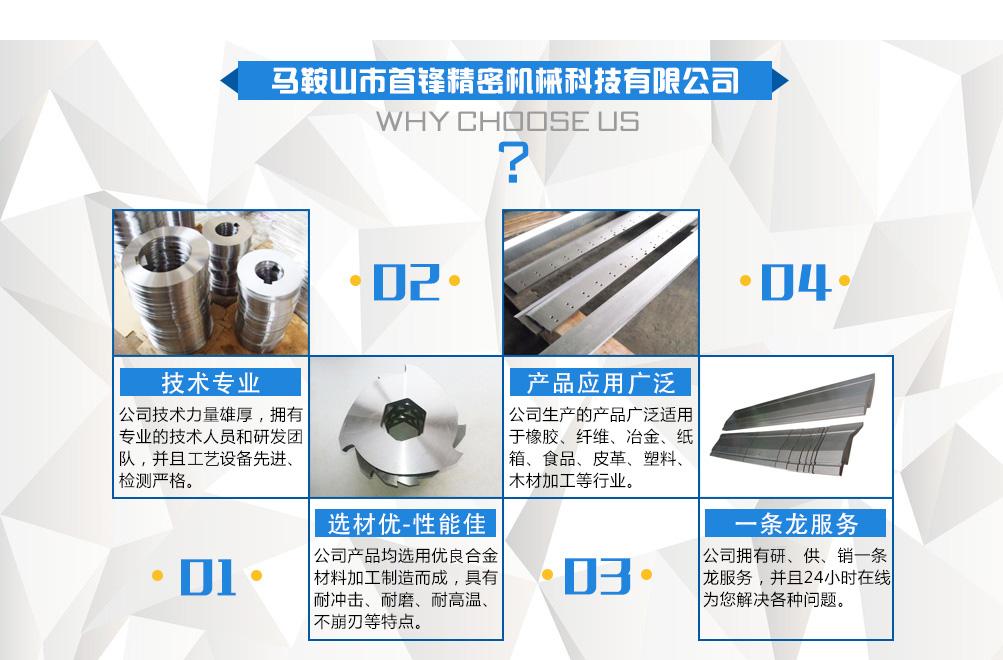 馬鞍山市首鋒精密機械科技有限公司位于中國之鄉馬鞍山市博望區博望鎮紅旗街。地理環境優越,交通便利。工業區內314省道貫穿,連接江、浙、滬、皖,距南京祿口國際機場30公里。   我們專業研發銷售各種機械圓刀、長刀、分切刀片、沖剪刀、剪板機刀片、等沖壓剪切刀具機械配件。產品廣泛應用于冶金、造紙、紙品加工、印刷、橡膠工業、塑料、木材加工、食品、金屬加工、皮革、無紡布、不干膠、膠帶、板材加工、軋鋼、紡織、五金機械等行業。   馬鞍山市首鋒精密機械科技有限公司,機械刀片加工歷史悠久,具有豐富的切削刀具加工經驗,擁有多條國內先進的研發設備和一套科學加工工藝,在保證了產品質量和品質的同時,使產品生產做到了程序化和規模化。   我們本著“誠信、求精、高效”的精神,期待著與國內外各界開展更為廣泛的交流與合作!